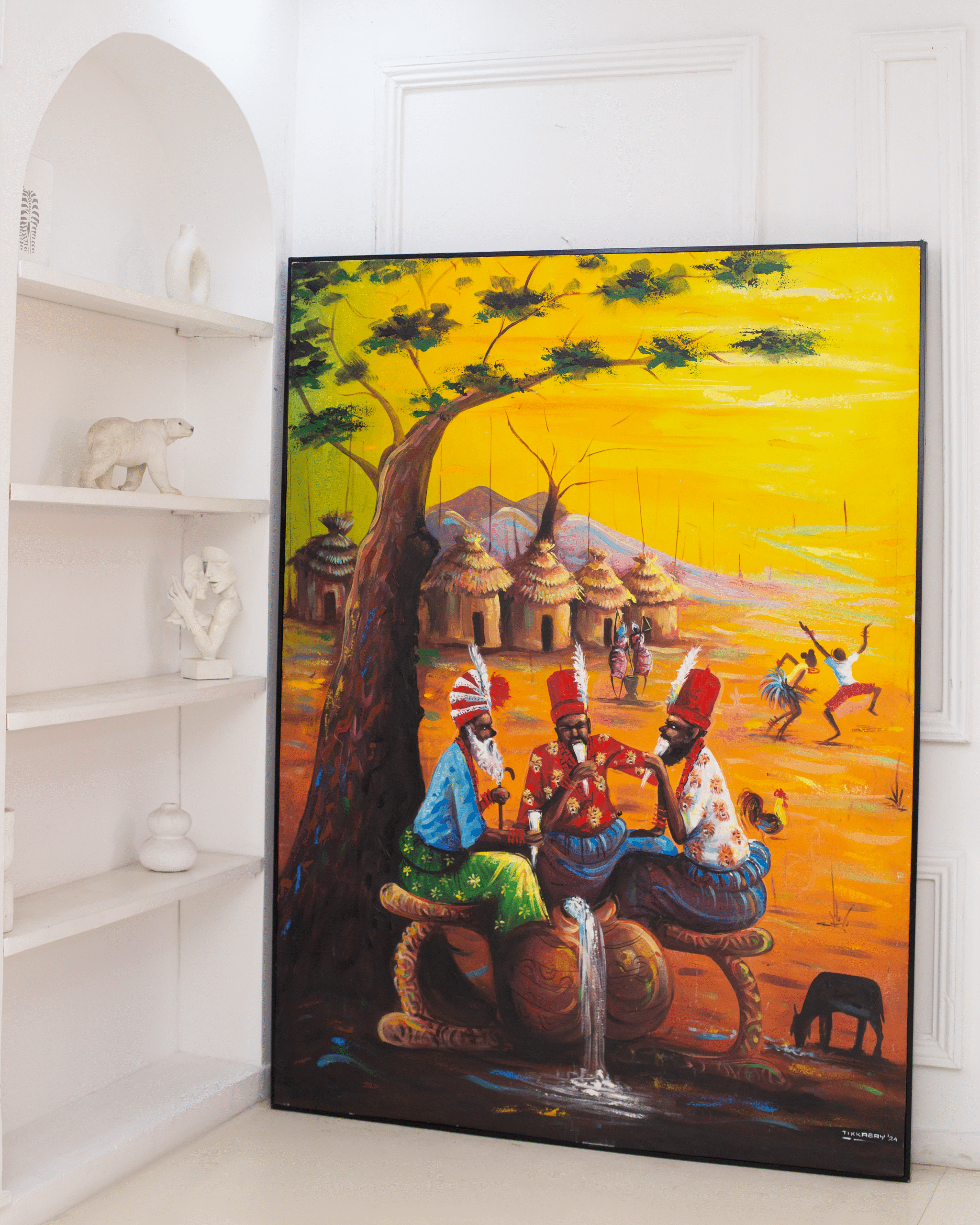 This artwork depicts the Eyo masqueraders, clad in flowing white agbada and crowned with striking red hats, their staffs held firmly in hand. They embody the spirit of the ancestors, carrying the magnificence of a centuries-old festival. The piece pays tribute to the enduring legacy of the Yoruba